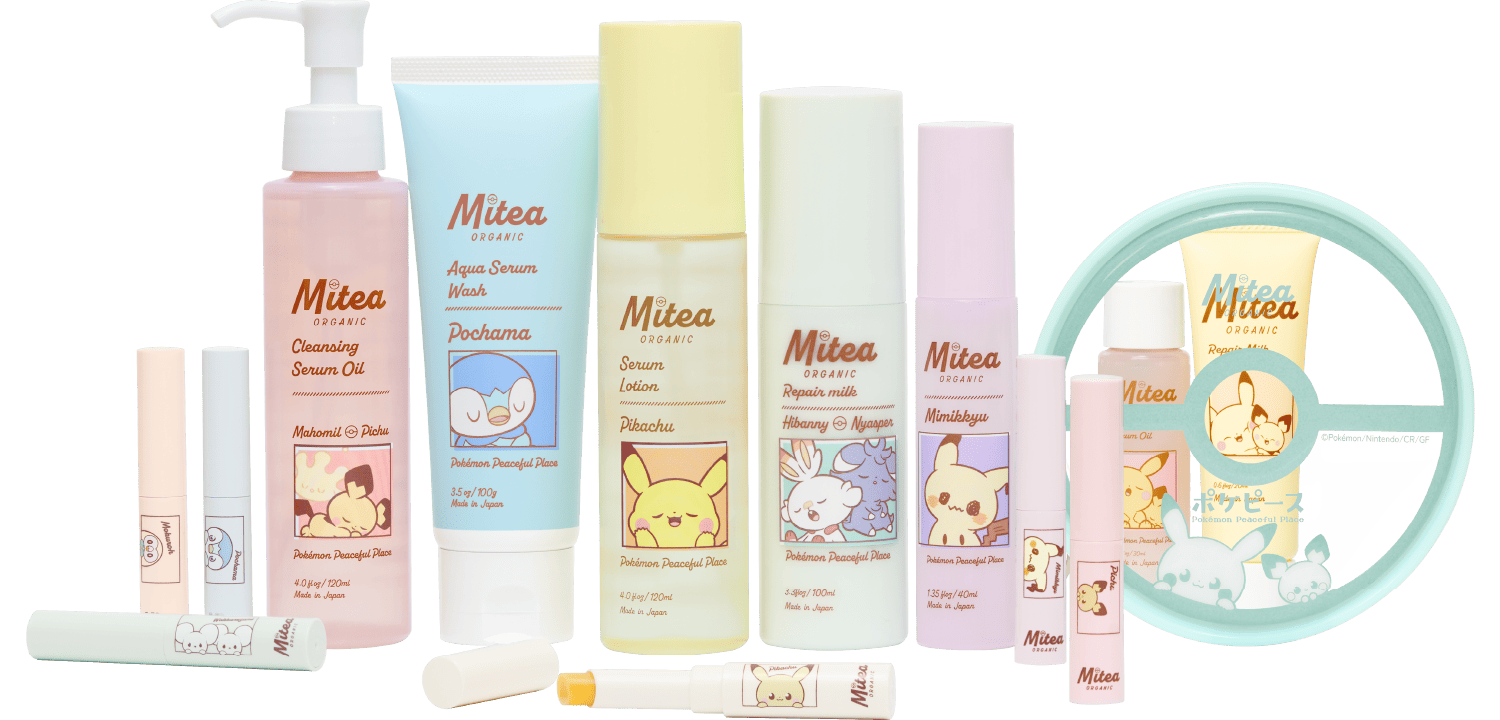 ミニサイズセット アロマミスト クレンジングセラムオイル アクアセラムウォッシュ ホワイトニングセラムローション リペアミルク セラムオイルリップスティック Special Campaign All Item Check ©Pokémon. ©Nintendo/Creatures Inc./GAME FREAK inc. ポケピース meets Mitea ORGANIC ポケモンたちのピースなくらしを描いた「ポケピース」と、 “日々のスキンケアタイムを、肌と心に向き合う幸せな時間にしてほしい” という想いで生まれた「Mitea ORGANIC」との、 初のコレクションが実現しました。 ポケモンたちのリラックスしたピースな表情が 日々のスキンケアタイムを心地よく、ピースに彩ります。 あなたの肌とこころにやさしく届く 幸せなピースとなりますように。 Schedule 2025年10月07日(火) 予約開始 2025年10月21日(火) 発売開始 Special Kit Minisize Kit 数量限定 Mitea ORGANICミニサイズセット ¥1,650 BUY 人気のクレンジングオイルとオールインワンでも使えるミルクが約2週間分のミニサイズになった、ポーチ付き数量限定セット。 # まずは試したい # 毛穴汚れ # オールインワンケア ポケピースデザインポーチ W135mm×H130m×40mm クレンジングセラムオイル 30ml・φ28×92mm リペアミルク 20ml・W40mm×H108mm×28mm Product Details Aroma Mist アロマミスト(ヘア&ボディミスト) 40ml¥1,320 BUY 気になるにおいをリセットし髪と体のうるサラを叶える、レスキューアロマミスト。 # においケア # うるおい・ツヤ # ヘア&ボディ # サラサラ・まとまる # 静電気防止 # フレグランスミスト 天然由来香料夜想ブルームブーケの香り 月明かりの下、ひっそりと花開くブーケのような甘すぎないフローラルノート。 香水の香りを邪魔をせずにふんわりと香るナチュラルでリュクスな香り。 植物由来清浄成分カキタンニン配合 悪臭の原因であるノネナールをケアし、外出先で付いたにおいをリフレッシュ。 髪と肌それぞれにフォーカスした植物成分 トウモロコシタンパクエキス(保湿) アロエベラ葉エキス(保湿) うるサラを叶える成分を配合。髪には指通りを、肌にはうるおいを与える成分でひと吹きで理想の髪と肌へ。 read more × close Cleansing Oil クレンジングセラムオイル 120ml¥1,848 BUY オーガニック×美容オイルの力で、毛穴の角栓・黒ずみ*1まですっきりオフする、W洗顔不要のクレンジングオイル。 # 角栓・黒ずみ*1オフ # 濡れた手でOK # W洗顔不要 # マツエクOK*2 Face Wash アクアセラムウォッシュ 100ml¥1,188 BUY オーガニック×マリンクレイ*3×竹炭*4の力で毛穴汚れを吸着・洗浄し、ふっくらみずみずしい肌に導く美容液洗顔料。 # 毛穴洗浄 # クレイ*3×炭*4 # 弾力ミクロ泡 # キメふっくら Serum Lotion ホワイトニングセラムローション医薬部外品 (販売名:ミティア セラムL) 120ml¥1,991 BUY オーガニック×植物性持続型ビタミンC*5の力で、透明感*6あふれるいきいきとした肌に導くしっとりとろみ感触の美白*7ローション。 # 美白*7 # 保湿 # 透明感*6 Repair Milk リペアミルク 100ml¥1,991 BUY 荒れた肌にも独自のW発酵ソームカプセルが角層深くまで浸透*8。ハリ・透明感*6のある肌へ。オールインワンでも使える高保湿乳液。 # オールインワンケア # ハリ・うるおい # 透明感*6 # 肌のお守りミルク セラムオイルリップスティック 全6色¥995 BUY NEW NEW NEW 06 カミナリクリア (透明タイプ) 07 チュチュピンク (発色タイプ) 08 フェアリーレンガ (発色タイプ) 01 マンダリーヌコンフィ (透明タイプ) 02 マロングラッセ (発色タイプ) 05 ピグピンク (発色タイプ) オーガニック×美容オイルの力で、うるおいを閉じ込め、色もちUP! カラリストと作り上げた、肌をきれいに見せる洒落感カラーのリップティック。 Special Campaign ポケピース meets Mitea ORGANICPeaceful GiftCampaign ポケピース meets Mitea ORGANIC製品をご購入いただいた方の中から、抽選で合計700名様にオリジナルグッズをプレゼント! 応募期間2025年10月21日(火) ~ 2025年12月31日(水) A賞 スキンケアラインナップ入り特別BOX 50名様 B賞 リップラインナップ入り特別BOX 50名様 C賞 スキンケアもリップも入るビッグポーチ 300名様 D賞 リップチャーム 300名様 ※商品画像はサンプルのためイメージです。色味やサイズ等の仕様に変更がある場合がございますので、予めご了承ください。 ※ポーチとリップチャームにスキンケアやリップ等の製品は付属しません。 応募方法 1 販売されているポケピース meets Mitea ORGANICの製品を購入 2 お買い上げレシートの写真または購入履歴画面のスクリーンショットを応募フォームにアップロード 3 必要情報を入力し応募完了! 応募フォーム ※10/7(火)~12/31(水)期間中のポケピース meets Mitea ORGANIC製品の購入が対象となります。 ※応募期間は10/21(火)~12/31(水)23:59となります。 ※購入対象はポケピース meets Mitea ORGANIC製品すべてが対象となります。 ※一部取り扱いのない店舗がございます。 ※ファミリーマートは店舗販売のみです。 応募方法をチェック! × close ポケピースとは? 世界のどこかにある、ちいさなまち。 ポケモンとにんげんたちが集まる、 シェアハウスがありました。 ここ